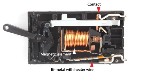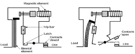 Thermal-magnetic circuit breakers contain two different switching mechanisms, a bimetal switch and a magnetic element. The bimetal serves as a means of handling overcurrent. Electrical current exceeding the breaker-overload rating heats the bimetal enough to bend it toward the trip bar. As the bimetal bends, it touches and rotates the trip bar to open the circuit.